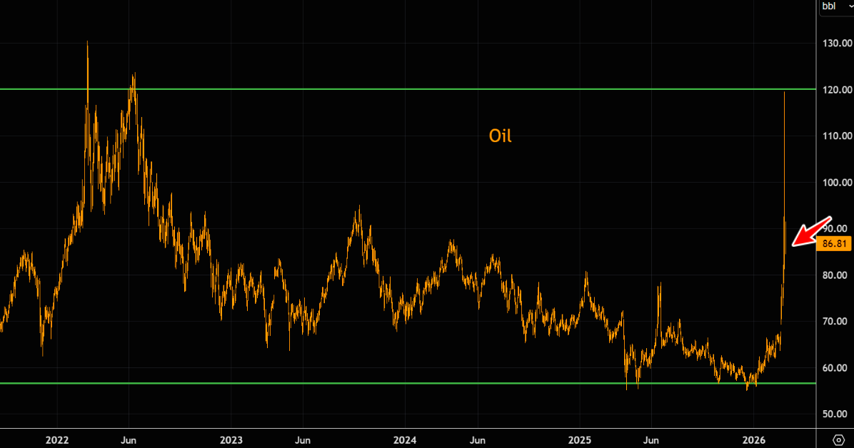 Crude went from roughly $60 in late January to almost doubling during yesterday’s peak panic, and is now back trading in the middle of the range. Moves like this are anything but healthy, the kind of two-way chaos where most participants manage to lose money both up and down.