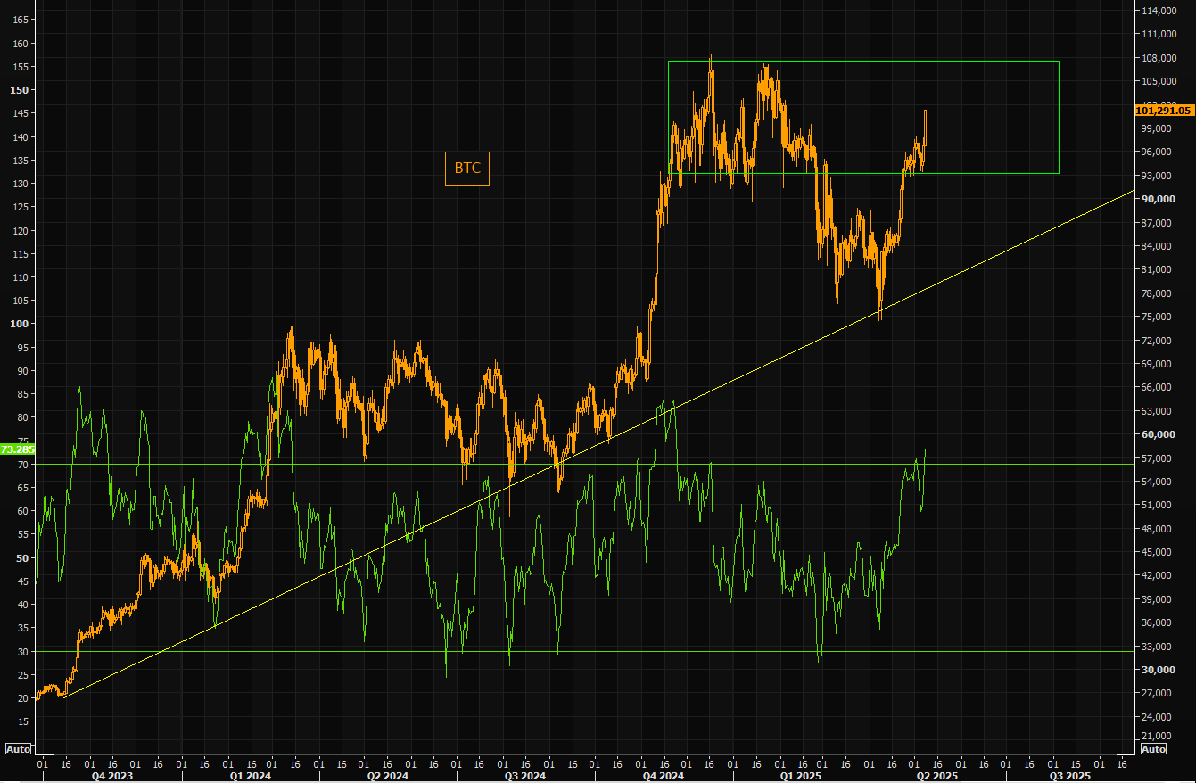BTC moving sharply higher, but we are still well below the upper part of the range. Momentum is very strong, RSI is getting overbought...but we have seen much more overbought levels.