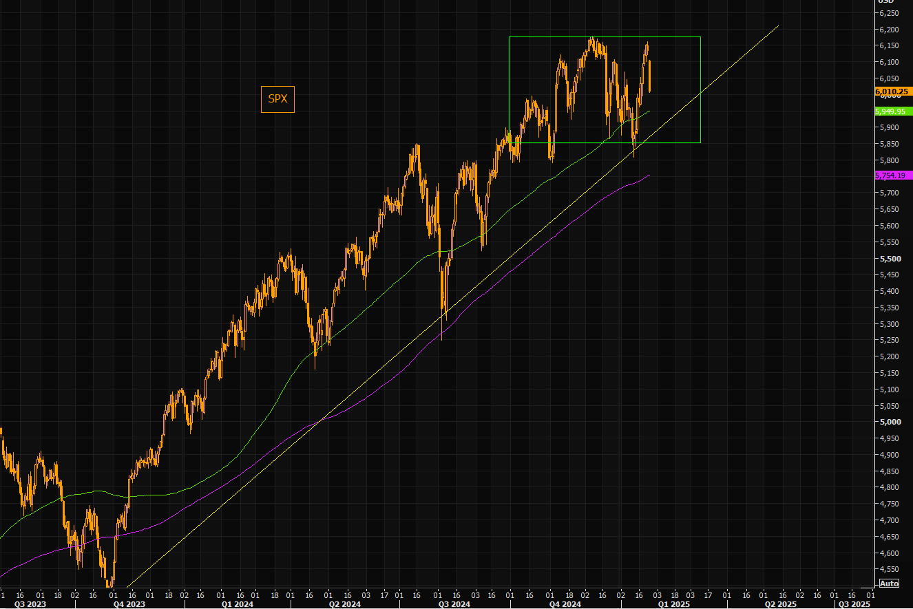 On Thursday we pointed out the logic on why it was "Getting Late To Chase The Market". SPX has reversed aggressively right in the top of the range. 100 day comes in around 5950 (futures), but the big supports are down in the 5900/5850 area. This is where the big trend line, and range lows come in.