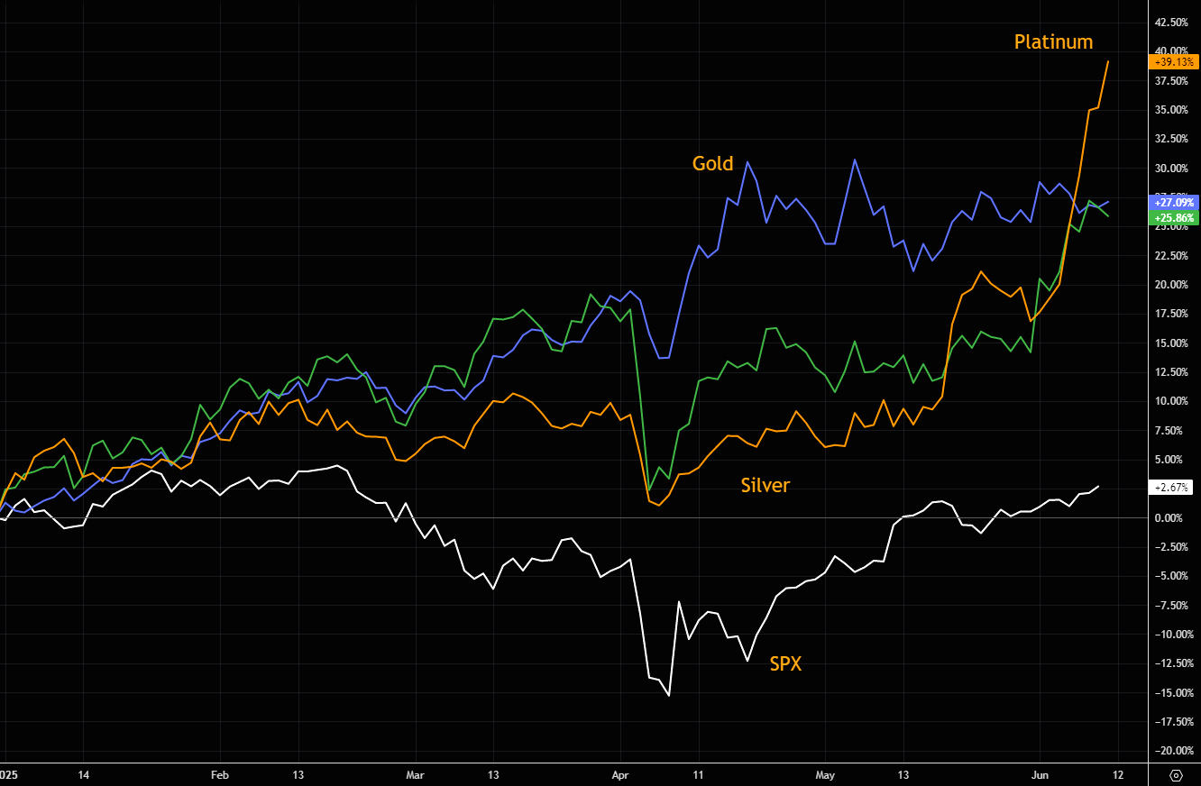 Trade dynamic precious metals, or boring SPX? Performance YTD in %.