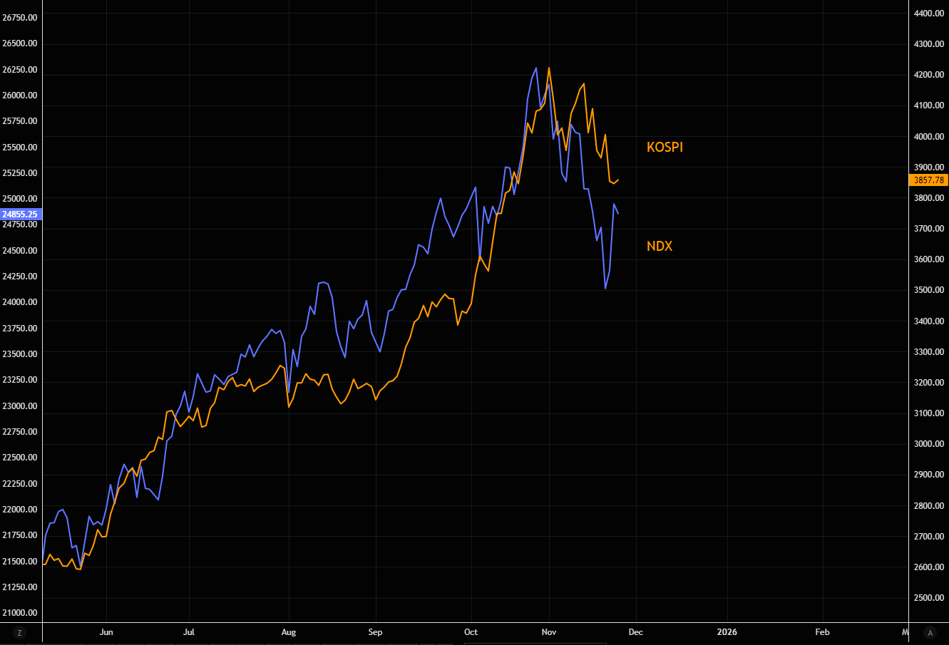 KOSPI, the Asian AI "sentimentor", refusing to get excited about the latest squeeze in NDX/AIQ. Chart 2 shows the KOSPI vs. the AIQ.