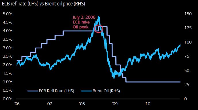Hartnett Friday poetry: From August 2007 to July 2008, oil surged from roughly $70 to $140 per barrel as subprime tremors spread (BNP, Northern Rock, Bear Stearns). Oil peaked on July 3, 2008, the same day the ECB hiked rates by 25bps, a move widely seen as one of the biggest policy mistakes in modern central banking. Just 74 days later Lehman collapsed and the GFC unfolded, with crude plunging to around $40 as credit stress trumped the oil shock and the ECB was forced to cut rates by 325bps. Today, the probability of an ECB rate hike by June 2026 is around 75%, while Wall Street is increasingly drawing parallels to the 2007–2008 setup.