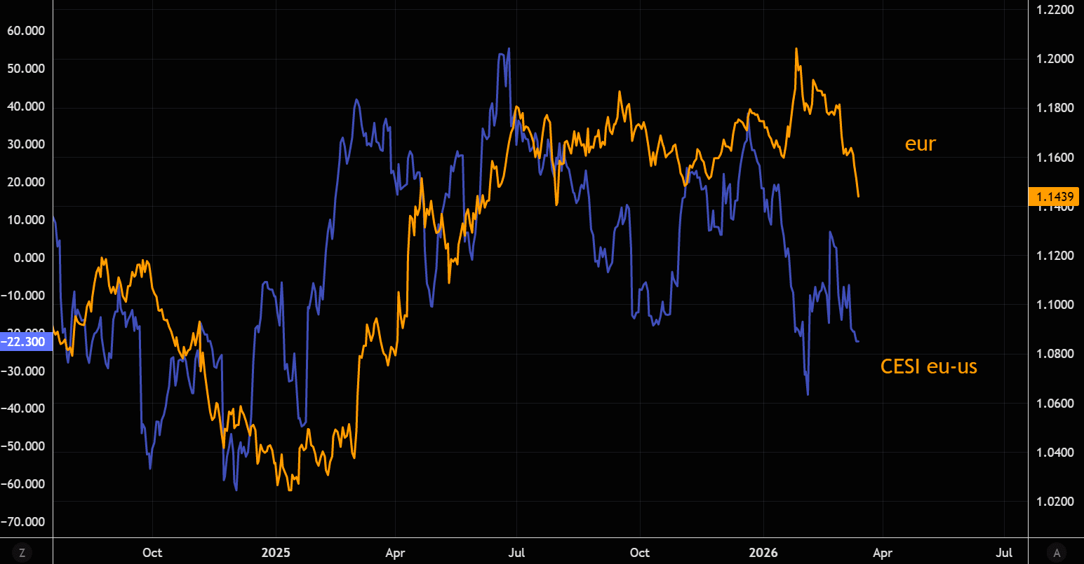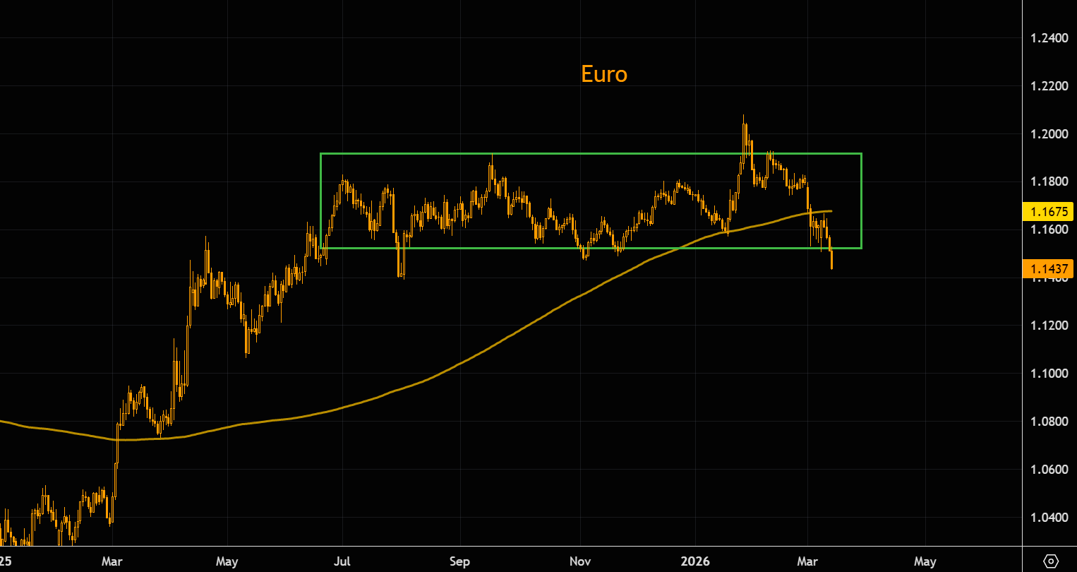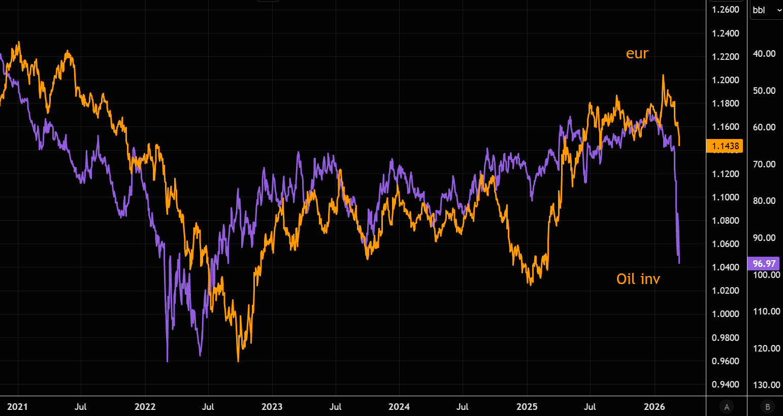 The last time oil traded around these levels the euro was near 1.02. We are not calling for a crash, but zooming out shows the euro–oil relationship is rather strong. A closure of the Strait of Hormuz would create a structural divergence favoring the USD while exposing the Eurozone to stagflation risks. Higher energy costs would increase pressure on the ECB and could force a hawkish pivot sooner than expected.