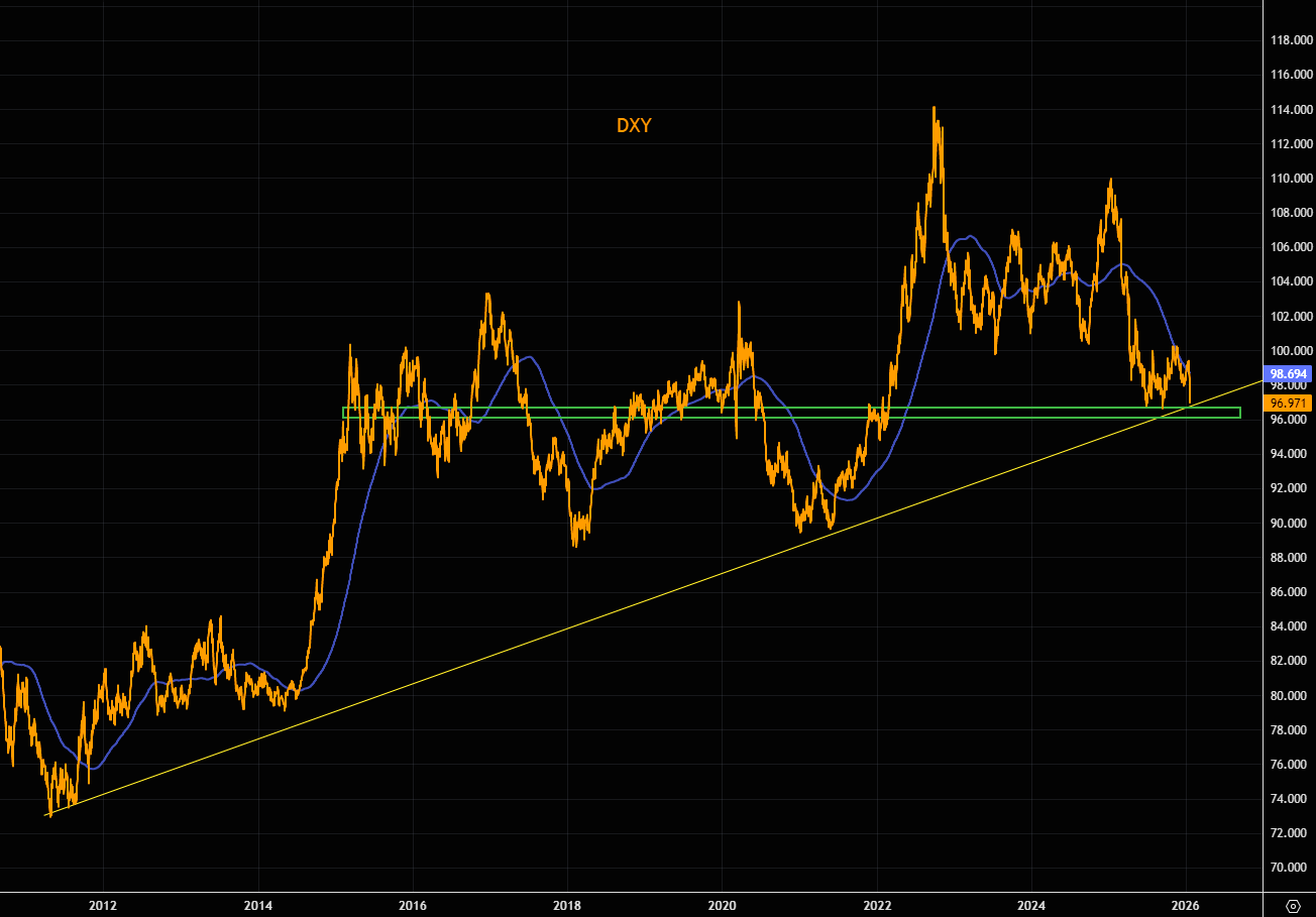 DXY approaching the massive trend line. 96, give or take, is the make or break level to watch.