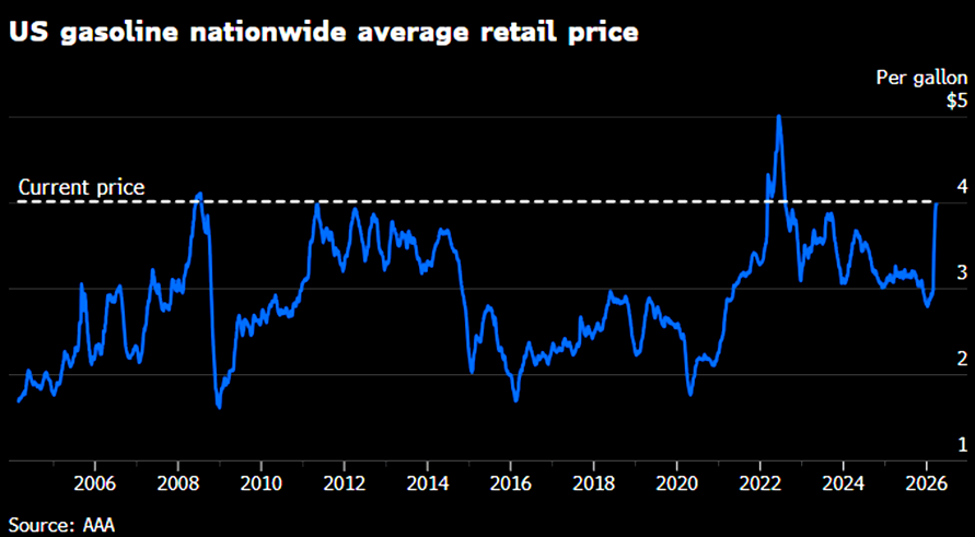 The US gasoline national average retail price has risen above $4 per gallon for the first time since 2022... It's the kind of price level that typically has triggered political alarms inside the White House (and Congress). Yet the usual economic fallout is missing. Demand remains resilient, delinquencies are stable, and energy’s share of spending keeps falling, suggesting this oil shock may be far less disruptive than feared.