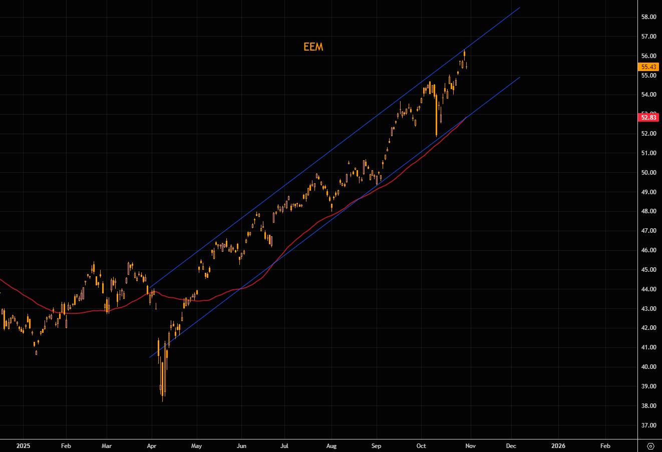 EEM in the upper part of the perfect trend channel. Channel lows and the 50 day way lower.