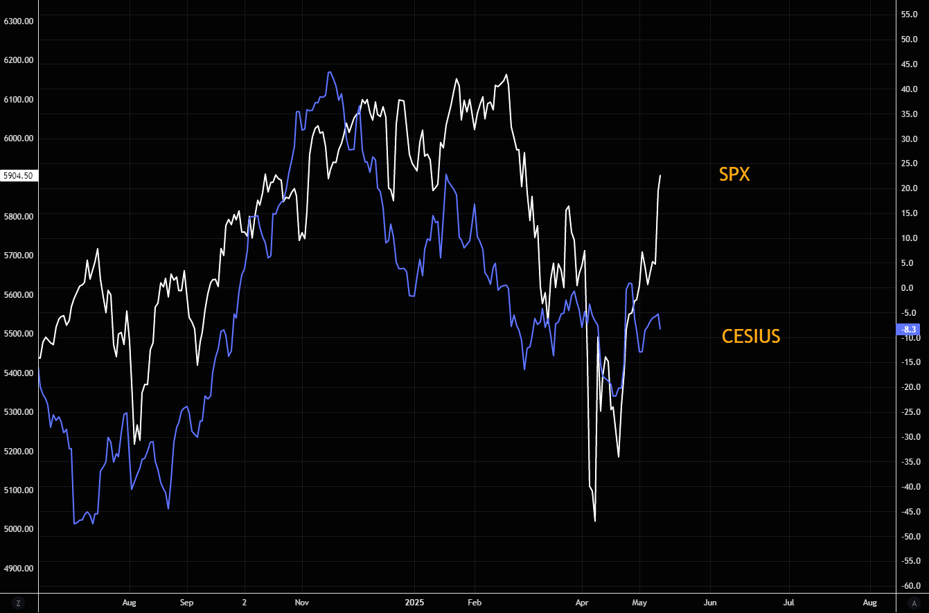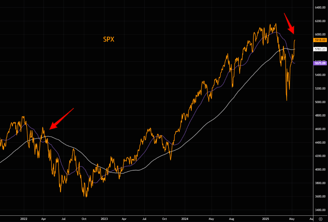 It wasn't long ago people were talking about the death cross in SPX. Back then we pointed out that last time the death cross occurred (2022) markets decided reversing aggressively, and managed overshooting the 200 day by around 3.5%. A similar overshoot now would take us to around 6k...