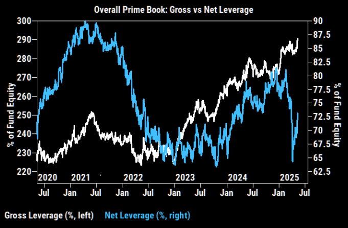 Flows are still almost entirely hedge fund-driven, with long-onlys absent and no urgency to redeploy—nets are low, shorts are high, and no one wants to buy back what they sold 30% lower. One trader today said, “We’re going to 7000,” and if he’s right, it’ll be painful unless positioning changes—quickly. (JPM's trader Matt Reiner)
