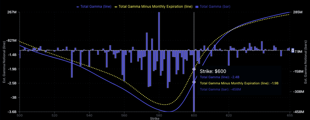 1. SPY negative gamma fades sharply above 590, meaning market makers have less to buy into strength