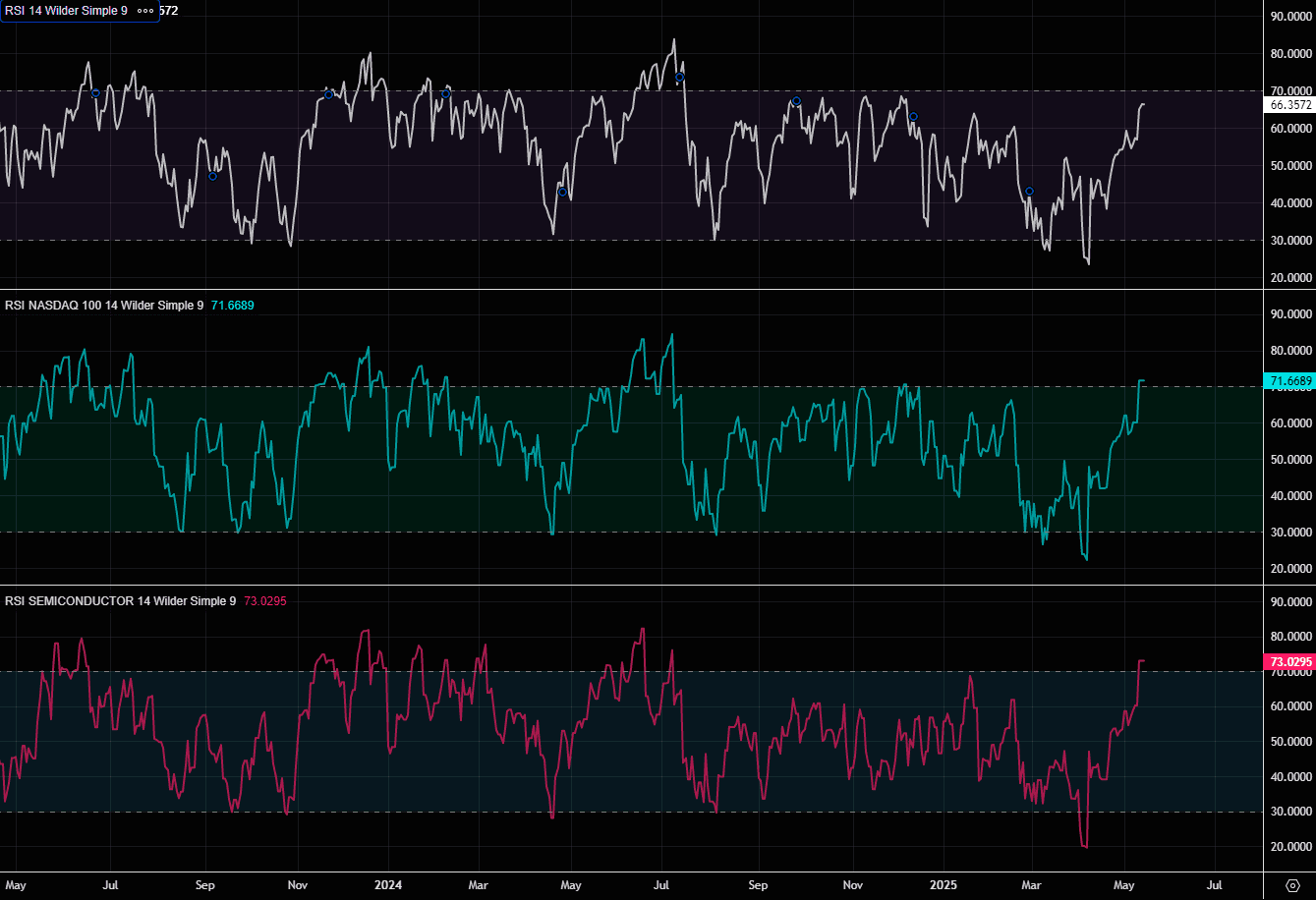 RSI across equity indexes has gone from extremely oversold to now hitting very overbought levels. RSI levels from the top: SPX, NDX and SOX.