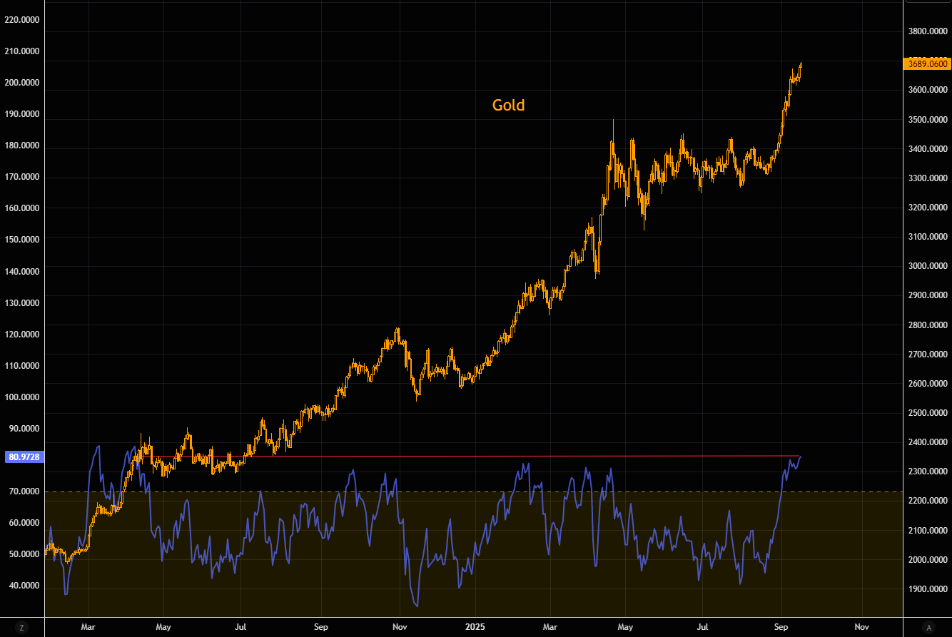 ...another new ATH for gold. RSI at the most overbought levels since April 2024. This is getting extended, but momentum is huge. Let's see how things develop post FOMC.
