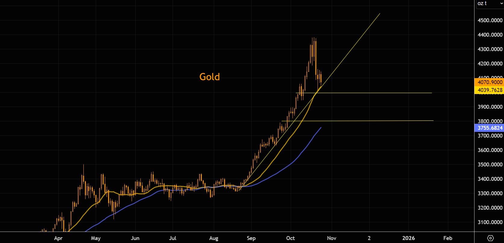 If this is the gold bounce, we wonder how a possible further move lower would look like. Crucial short term supports coming up soon. 21 day comes in slightly lower, as well as the steep trend line and then the magical $4000 level. A close below and the next big support comes in at $3800 (50 day). Resistance at $4200.