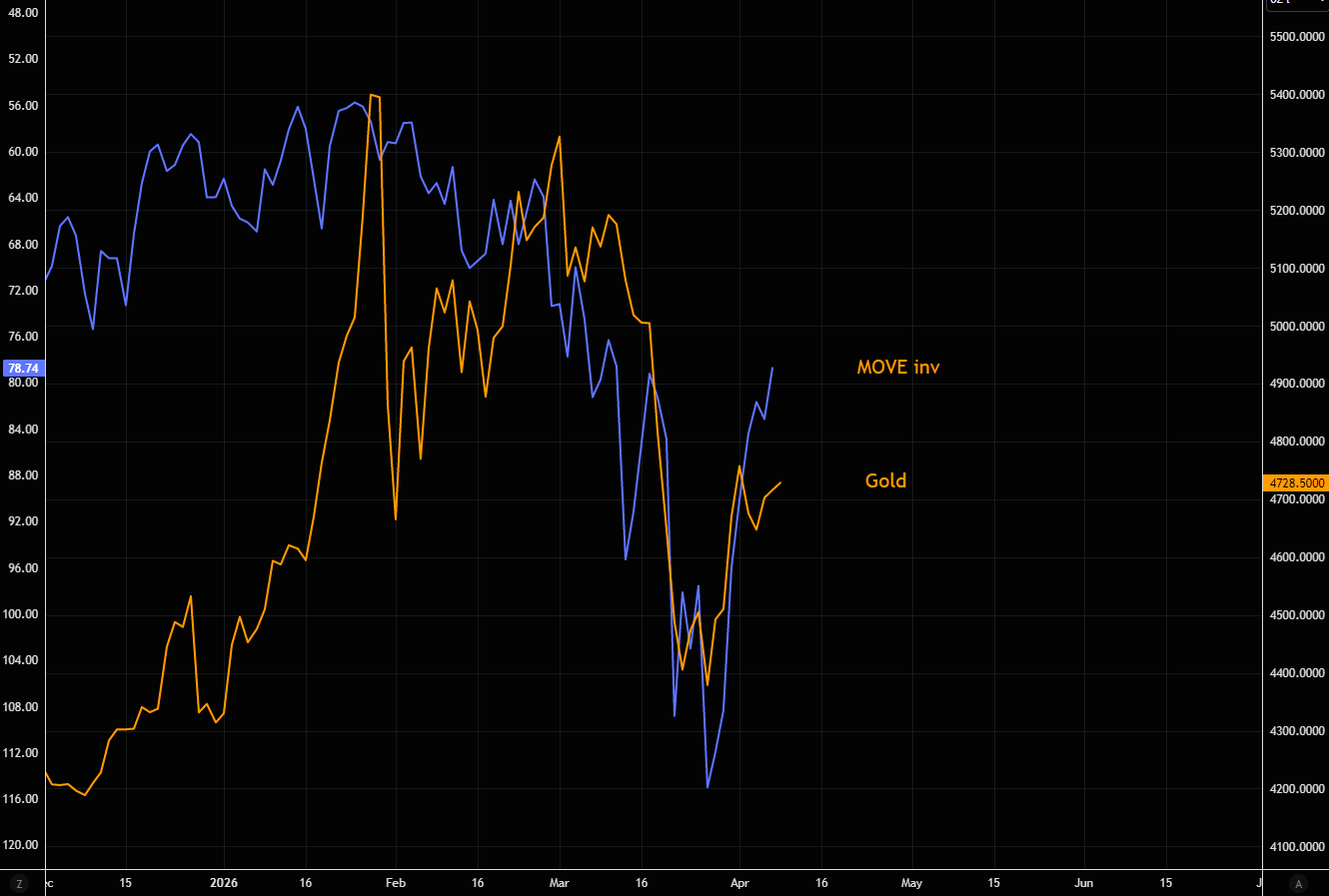 Few are talking about it, but gold and bond volatility are closely linked. The chart shows gold vs inverse MOVE.