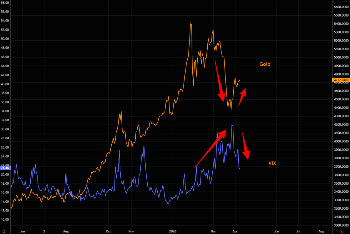 The idea of gold as a global “VIX hedge” doesn’t hold up. During the latest volatility spike, it moved in the opposite direction.