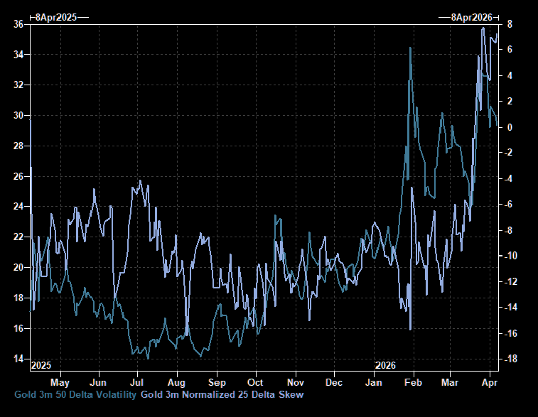 Normalized 25-delta put-call skew remains at very elevated levels. Investors are paying up for downside protection, something that is new and rare in gold.
