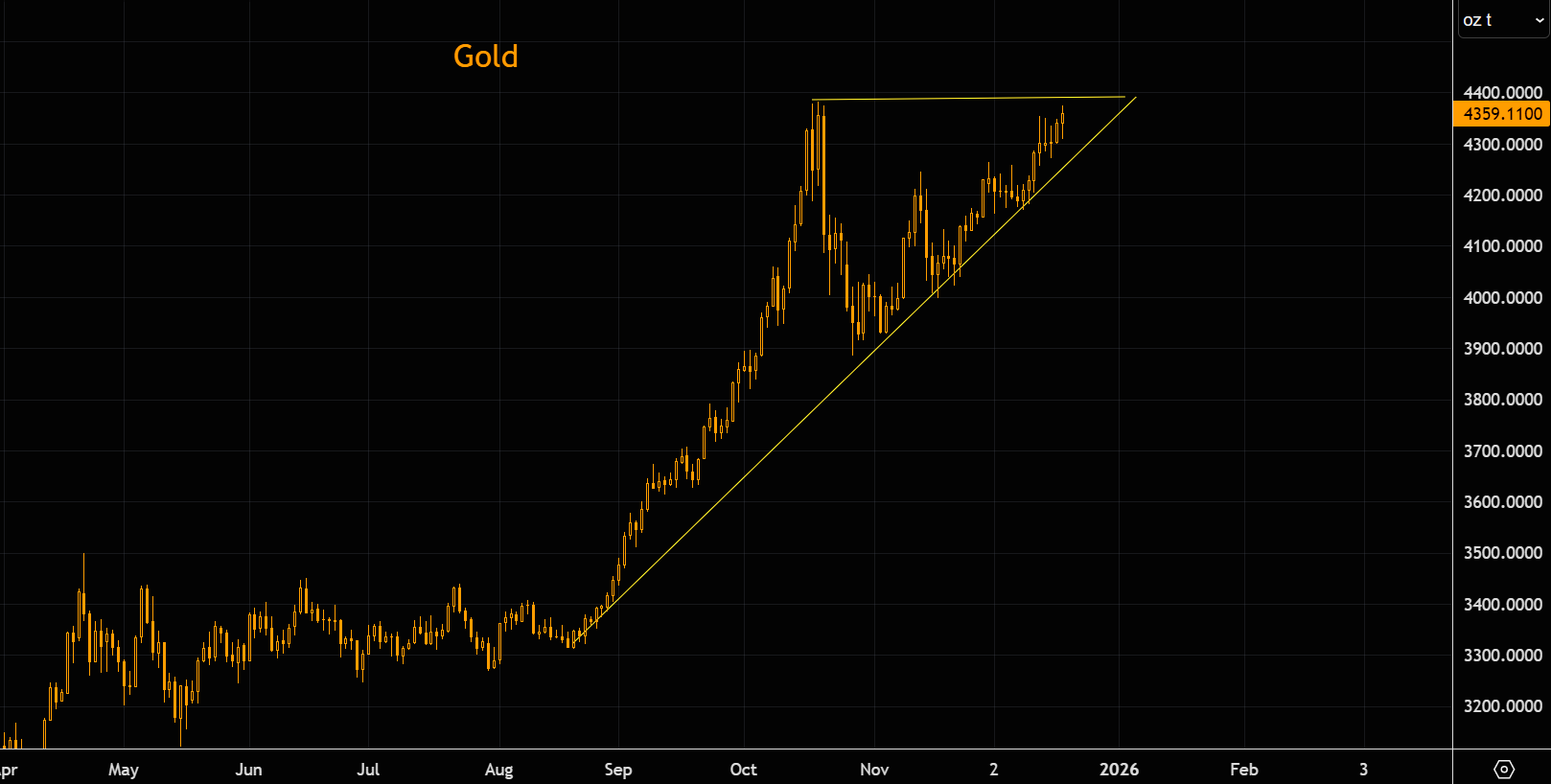 Gold approaching ATHs and delicate resistance levels. The shiny metal is basically trapped between the longer term trend and the ATH resistance area.