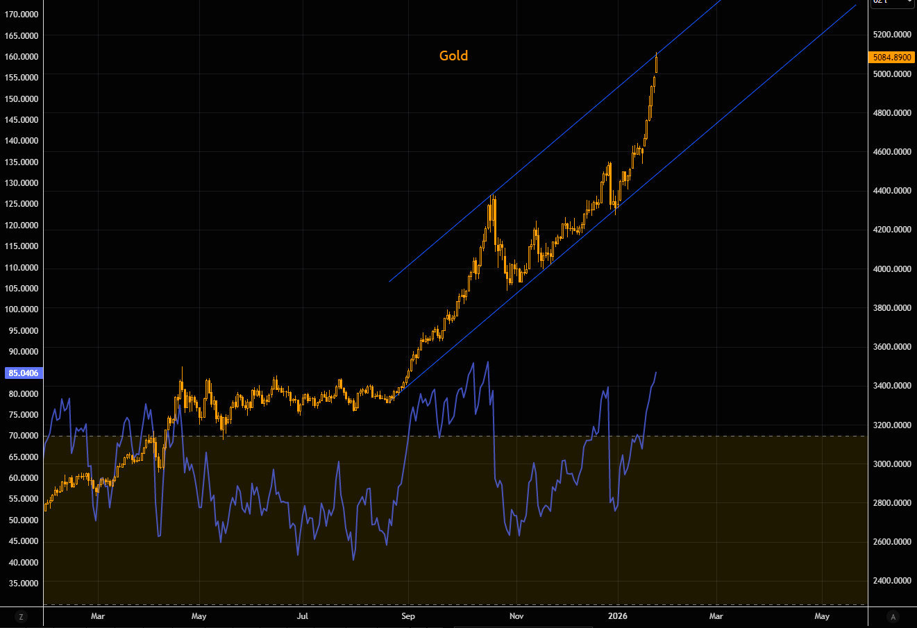 Gold rallied roughly 30% from late August into the October highs, pushing into the upper end of its trend channel. The latest squeeze has delivered a similar ~30% gain, with price once again tagging the same channel top. Momentum is stretched: RSI is back near its most overbought levels, albeit still slightly below the extremes seen at the October peak. In early November (here) we laid out our gold trading squeeze logic, noting that October had seen an exodus in gold (chart 2). This is starting to feel the inverse...