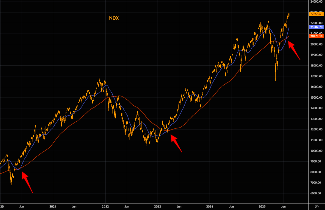 Previous golden crosses over the past years have resulted in the NDX surging more than anyone thought was possible. We all remember the melt ups that started post the golden crosses back in 2020 and 2023. The latest one occurred in late June and has worked fine since then. Is the pain trade still way higher?