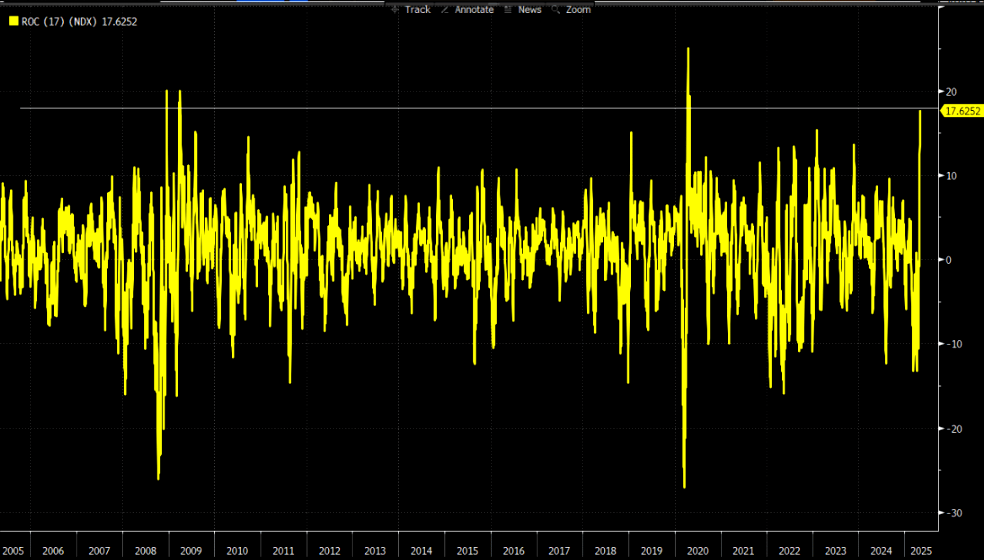 NDX is now up approximately 18% over the past 17 sessions marking one of its strongest and fastest rallies in the last 20 years. The move began from deeply oversold conditions, with the 14-day RSI bottoming at 23 (its lowest since Q4 2018), and has now surged toward overbought territory, with the RSI currently near 61. Let's have a look at the tactical back-drop as we enter this week.