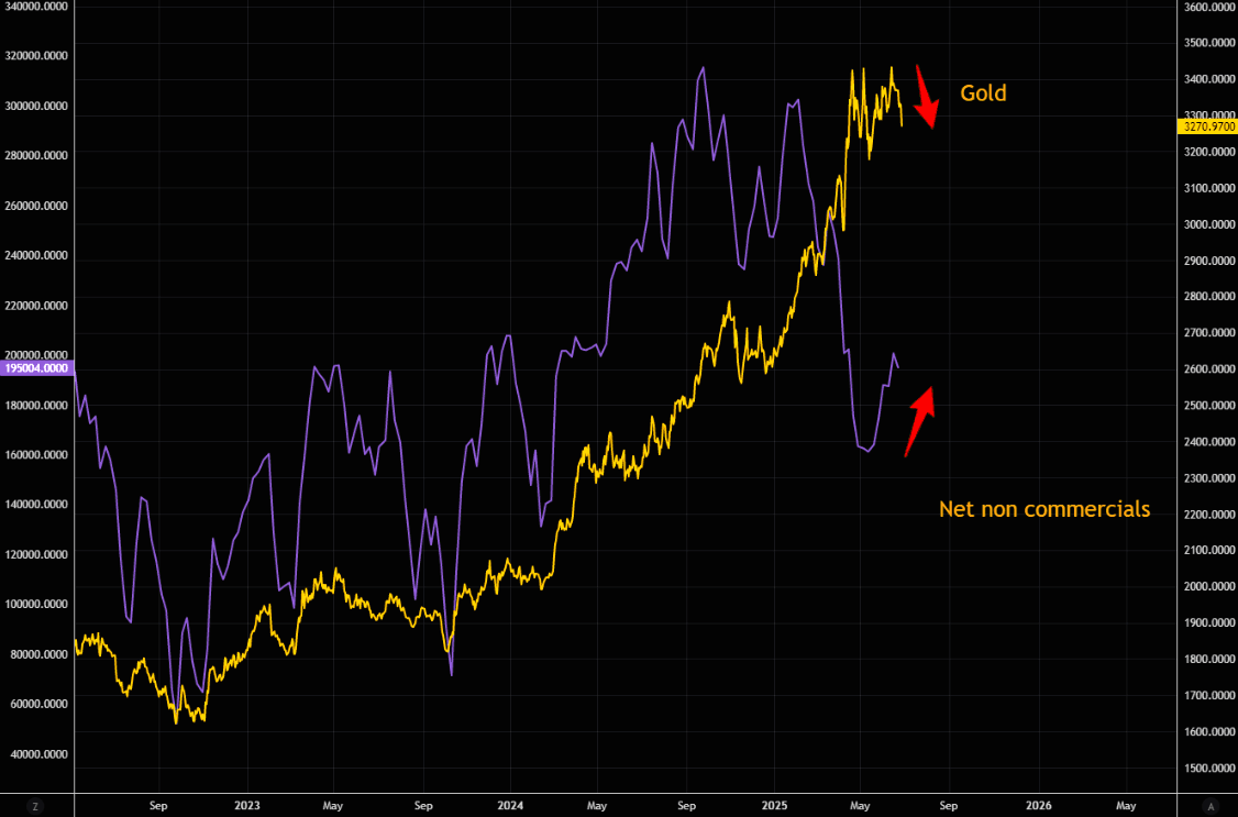 Gold net non commercials have been in denial for months, but decided to increase the gold long just in time for the latest move lower...