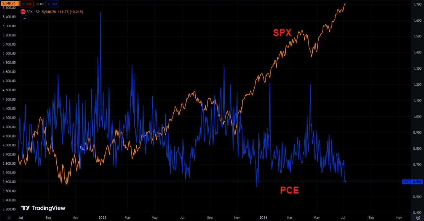 Who needs puts when markets only grind higher? SPX vs imploding put call ratio.