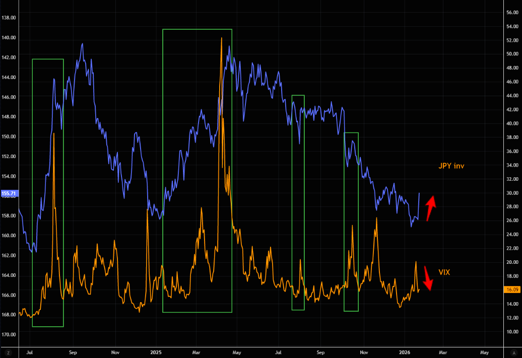 The latest moves in JPY have been violent (more here). When the world’s third most-traded currency behaves like this, stability is clearly lacking. The question is whether VIX starts to pay attention.