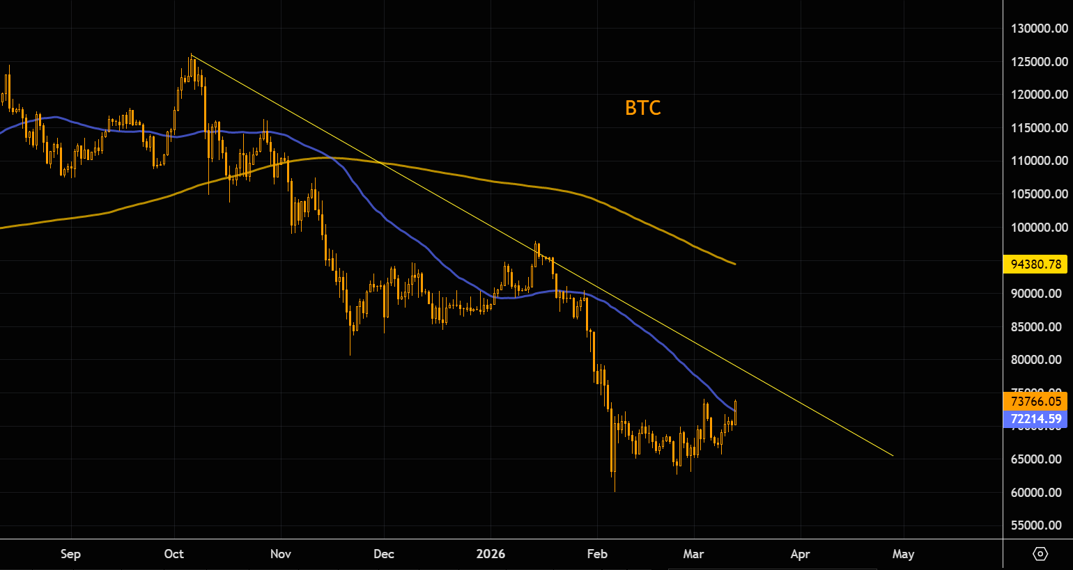 Bitcoin has been showing signs of life since the 10am slam faded. BTC is currently breaking above the 50-day moving average, but still trades below the negative trend line (around $78k). A close above that level could trigger a much more aggressive squeeze. The 200-day moving average sits much higher, near $94k.