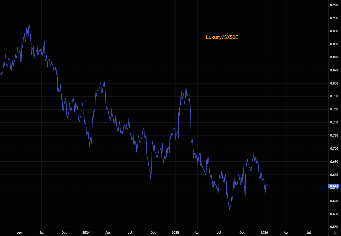 EU luxury vs SX5OE ratio has come down substantially since mid November local highs. GS research expects 4Q reporting to drive consensus EPS upgrades and catalyze share price outperformance on the back of a solid US high-end consumer environment and ongoing stabilization in China.