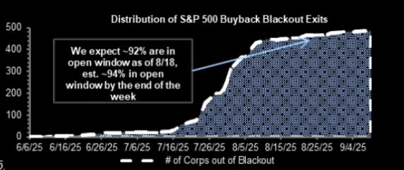 Goldman estimates that ~92% are currently in open window with ~94% in open window by the end of the week. In other words, does not get much better than this - the buyback machines are in full force. Next blackout starts on the 14th of September so 15 more trading days with marvelous support.