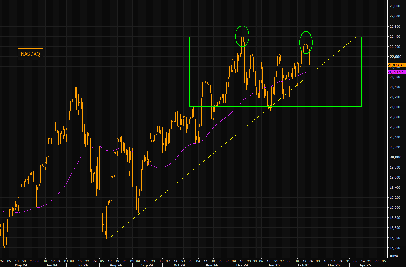 So far NASDAQ looks to have reversed in the upper part of the range. First support to watch is the 50 day, coming in right where the trend line from August crosses. Range lows are way lower...