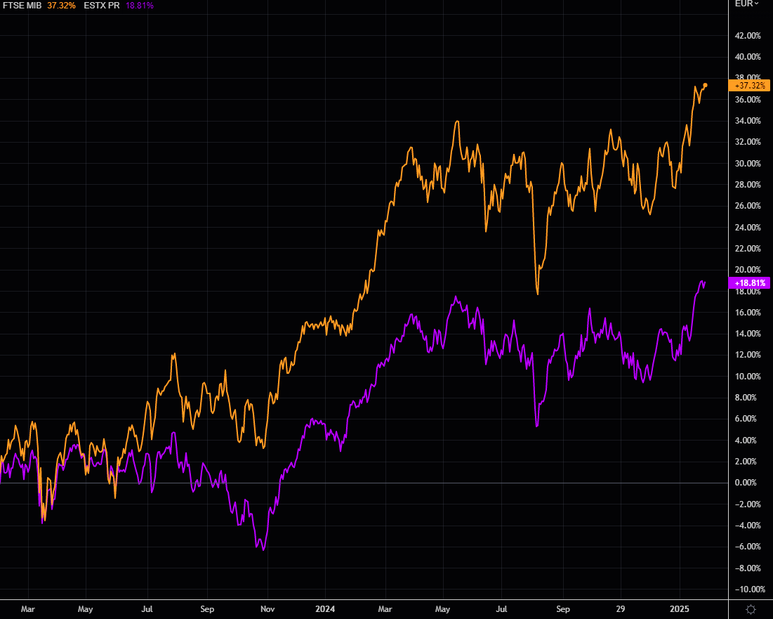 Not all populists are inflationary and irresponsible. Meloni has been performing magic for Italy since she took over power. Both Italian bond and stock markets have outperformed since Meloni took office in 2022. Let's have a look at the Meloni-miracle - and we will end with a match-making pitch for Musk....Chart shows MIB vs SX5E over the past 2 years (%).