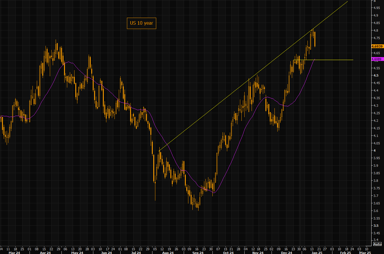 US 10 year putting in the biggest down candle in a while post the CPI numbers. First support at 4.6%, where the 21 day comes in.