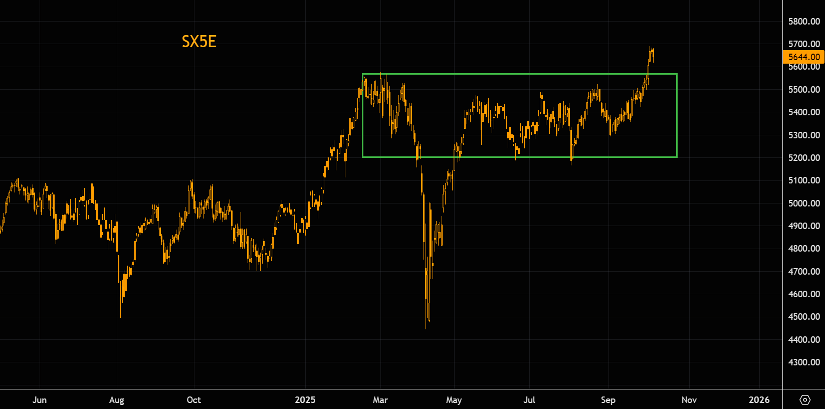 SX5E broke above the range highs last week. Small pause to catch some breath before the next leg higher kicks in? We stay long with the theme "things can only get less worse".