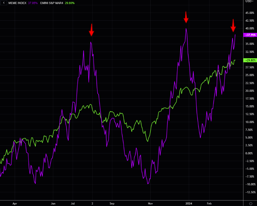 MEME is back, trading at "delicate" levels again, beating the SPX once again over the past year (chart in %).