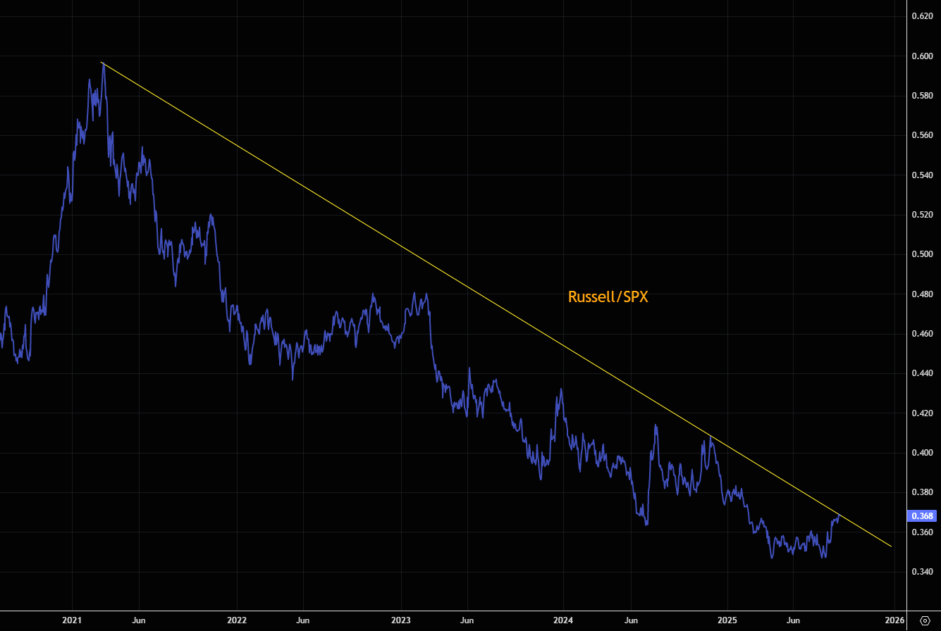 Russell beating the SPX since early August. Just a blip, or do we see a proper break out attempt above the longer term negative trendline?