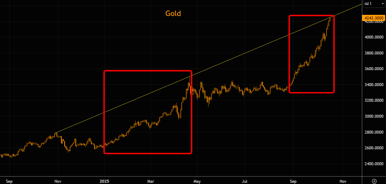 Gold is reaching the upper trend line. We have been outlining the similarity with the early 2025 break out in gold for almost 2 months. The percentage gain from the break out is basically the same now... but the latest squeeze happened in 1/3 of the time.