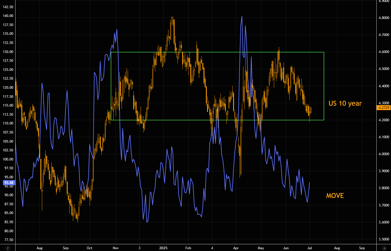 Bond volatility seems to be finding the “natural” floor level as the US 10-year bounces off range lows. We saw an uptick in MOVE yesterday. Nothing huge, but watch the MOVE closely...