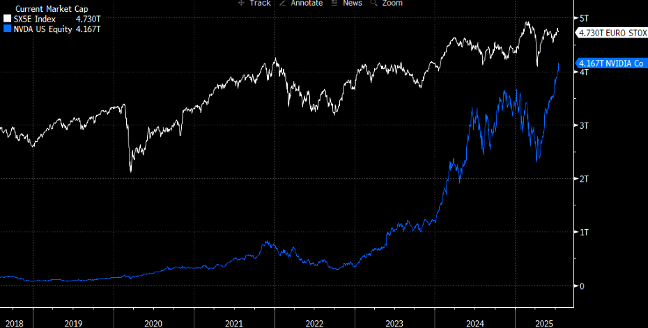 While people are debating whether to be long the European bull story, GS points out: "NVDA is now closing in on 90% of the entire SX5E in terms of mkt cap (4.1tr vs 4.8tr)".
