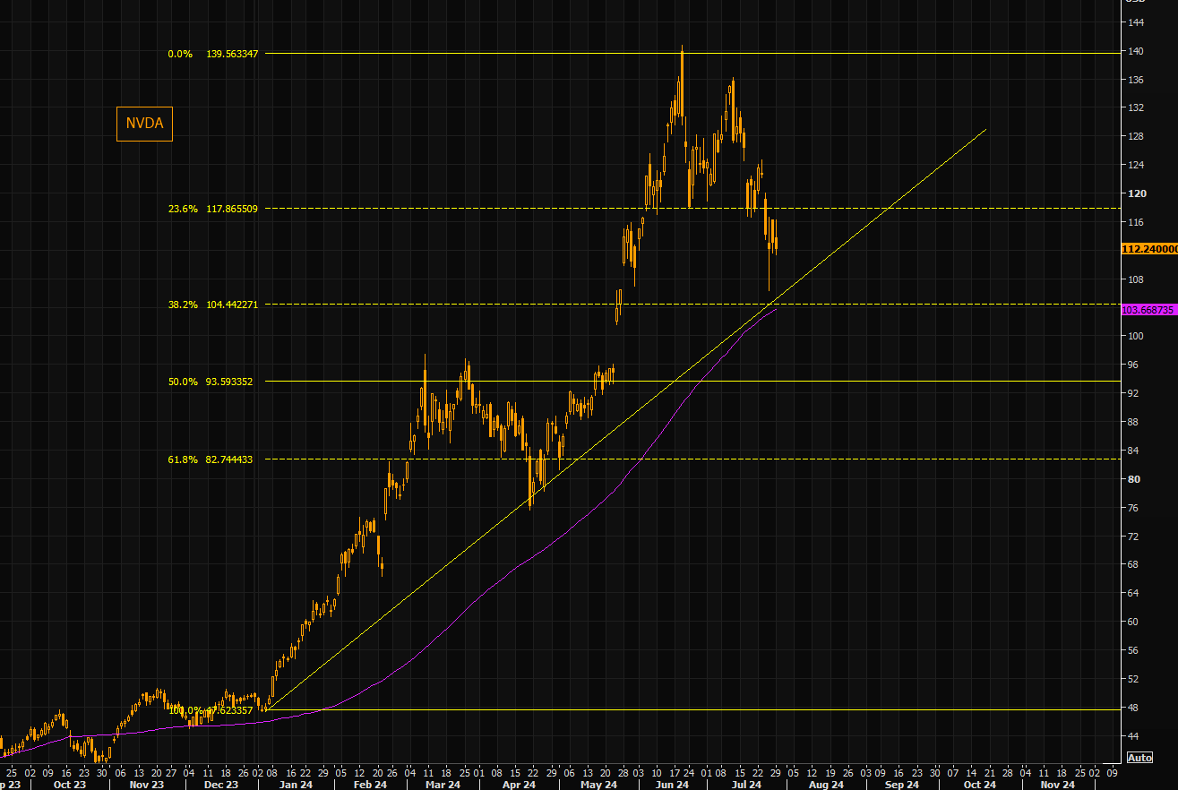 Another day where NVDA fails to bounce. The big support is down around $104. This is where the long term trend line comes in, the 100 day moving average, as well as being a big Fibonacci level.