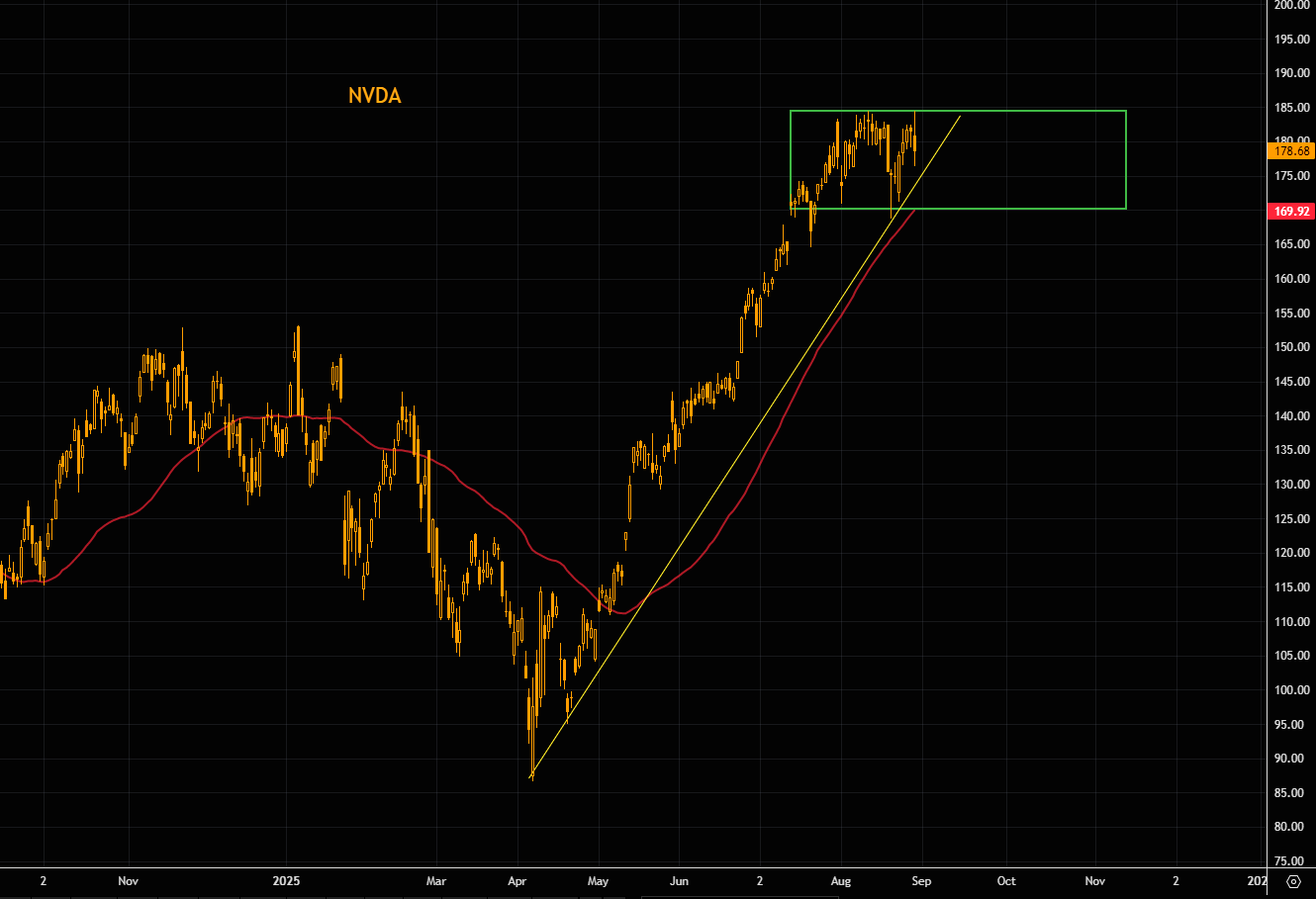 NVDA has been stuck in a range since late July. Short term support at $179, resistance $185. Note the 50 day comes in at range lows. Maybe this just needs to range for some time?
