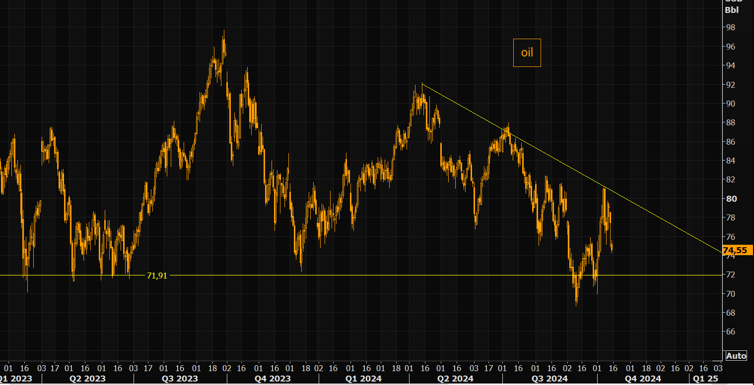 Oil continues producing wild moves, while trading without a longer term trend. Support is down around $72...resistance is the shorter term negative trend line (where oil reversed some sessions ago).