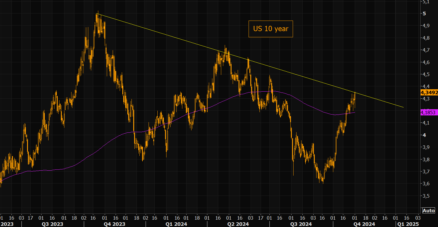 On September 25 (here) we outlined our logic for why rates were about to move higher. The 10 year is printing 4.35% as of writing, trading at the highest levels since early July. Drawing trend lines is not an exact "science", but the entire 4.3%/4.35% area is huge.