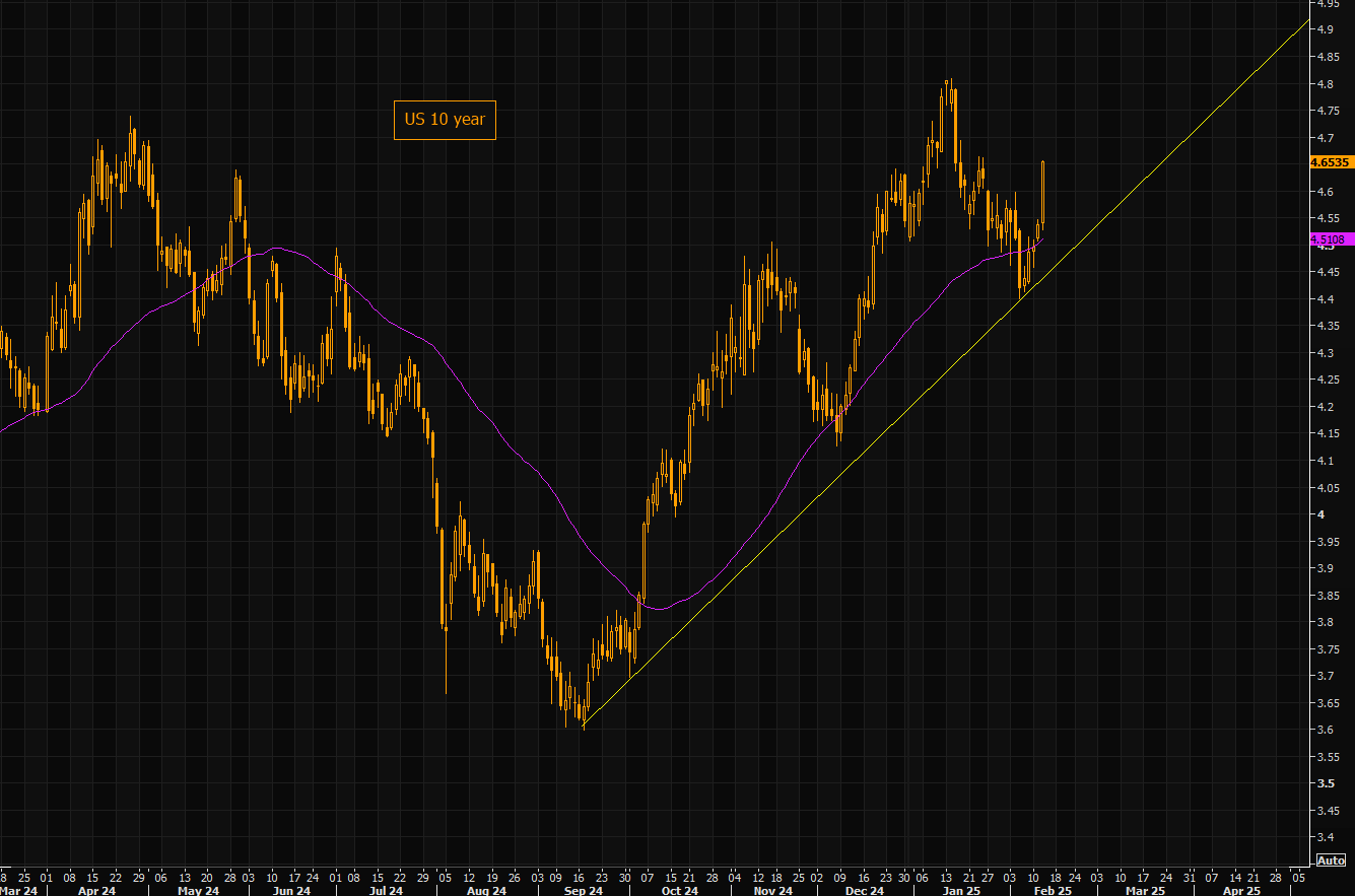 Massive move higher in the 10 year. Haven't seen such a "clean" up candle in a while. Note we are once again well above the 50 day. Upside resistance levels: 4.7% and then the big 4.8% level.