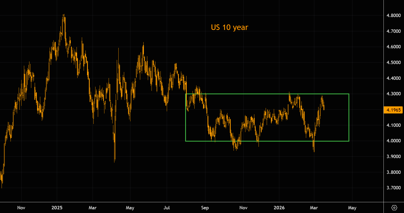 US 10 year reversed right on the huge 4.3% resistance. Add it to another asset stuck in a strong range.