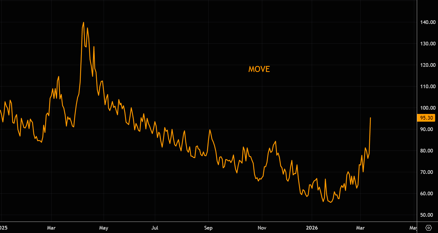 Bond volatility is ripping higher again. The MOVE index continues to surge as rates react to the latest energy shock.