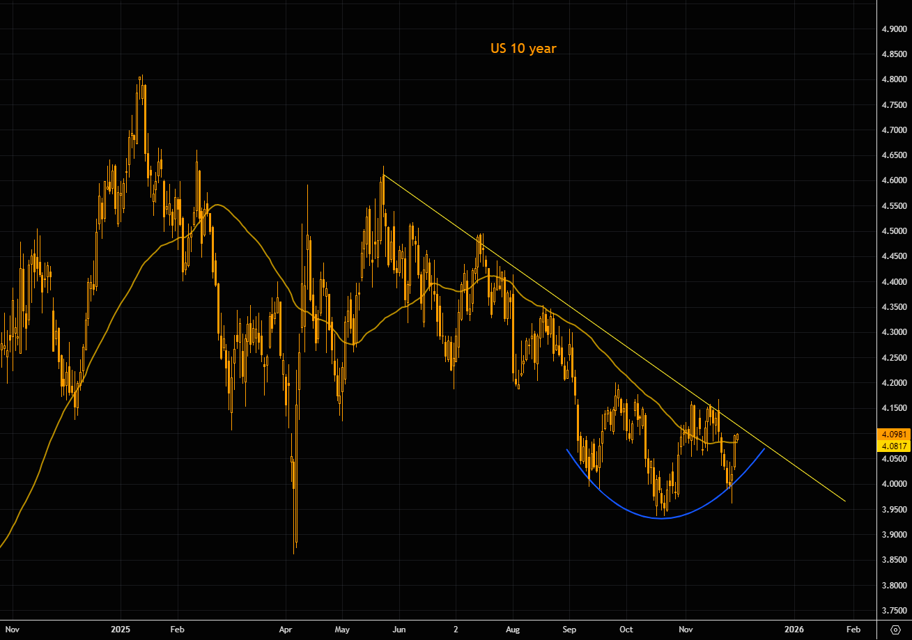 US 10 year has held the huge 4% level (give or take) for the third time. The negative trend line that has been in place since May comes in around the big 4.1% area. Note the 50 day comes in here as well. A close above that area and things could get squeezy in rates land.