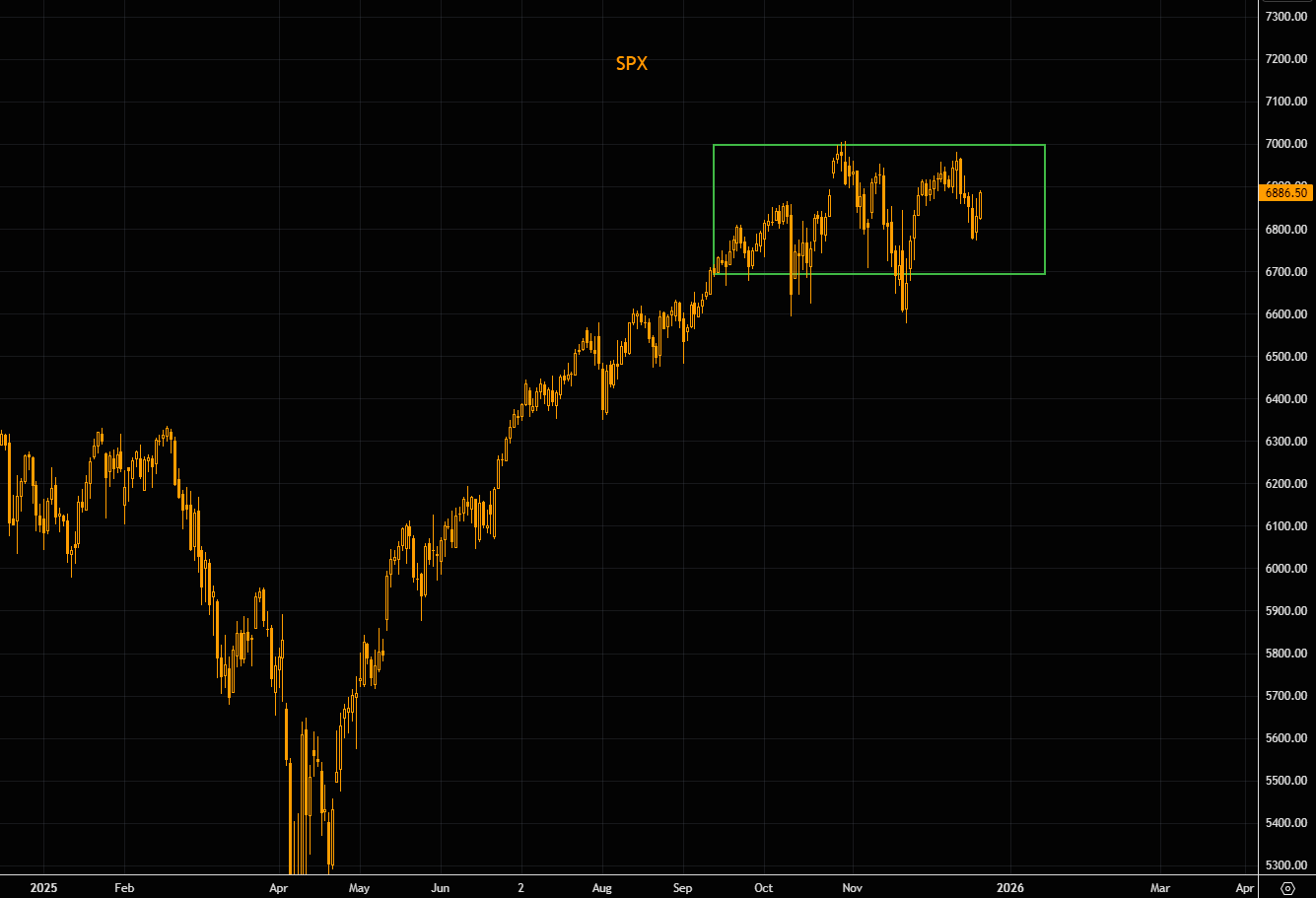 SPX remains stuck inside the range that has been in place since September. So far no real Santa rally, but no real bear either. We are not getting excited until the market decides breaking out, either way.