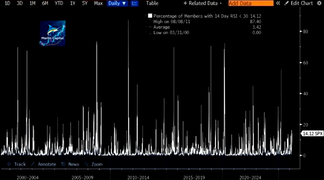 Only ~14% of SPX stocks have hit oversold levels so far (RSI < 30). For context, that number reached >50% during last April’s Liberation Day selloff and >40% during the 2022 Bear Market.