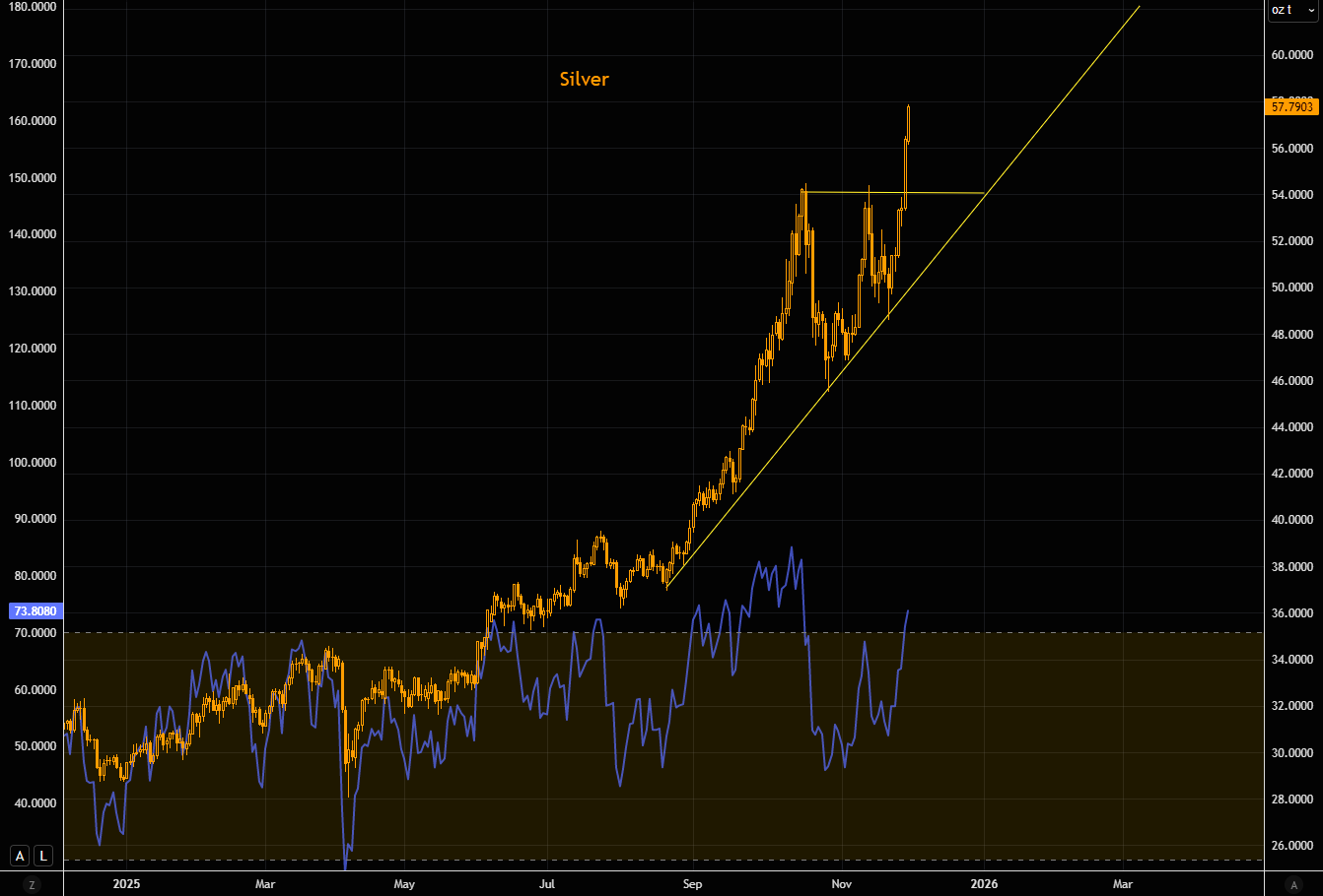 Silver extending the brutal break out move. The metal is up almost 20% since lows 7 sessions ago. We are in overbought territory, but RSI saw even more extreme levels during the September/October upside panic.