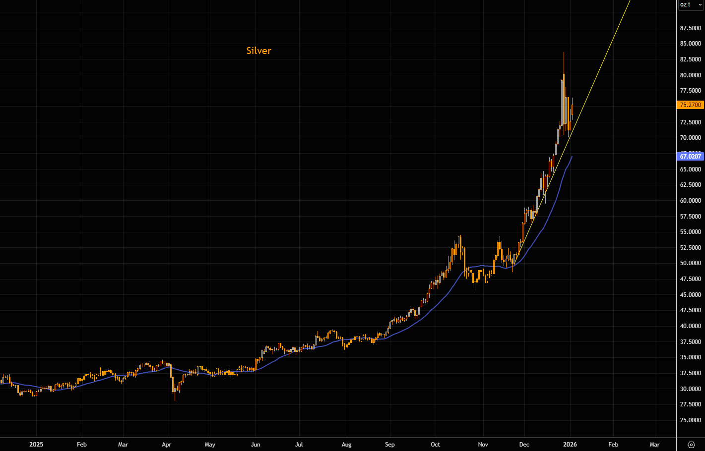 Silver has been in a parabolic phase for some time, with the short-term trend extremely steep and prices stretched well above the 21-day moving average. Near-term support sits around $72, with resistance at all-time highs.